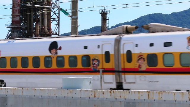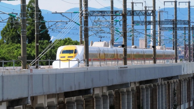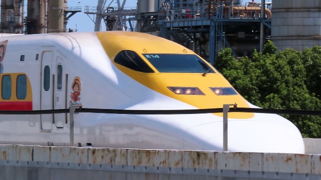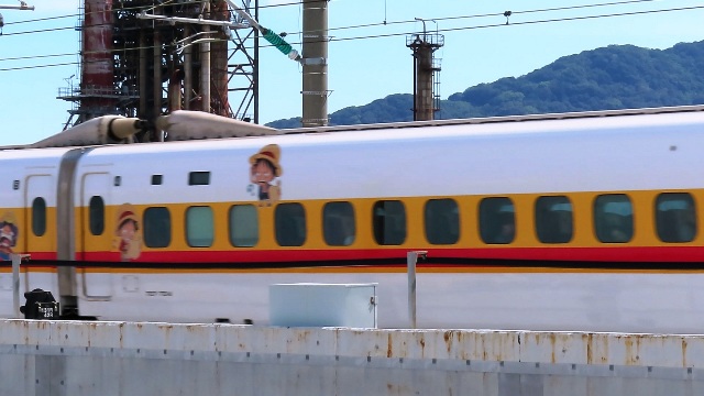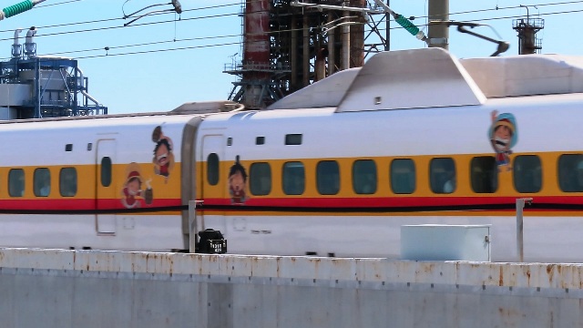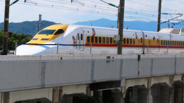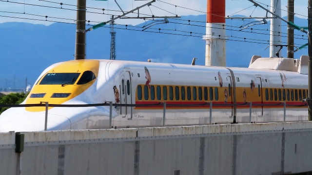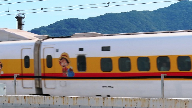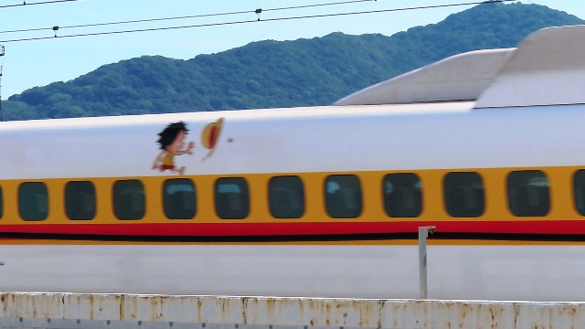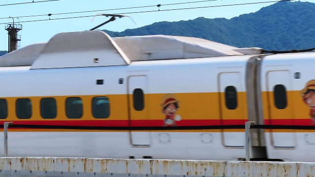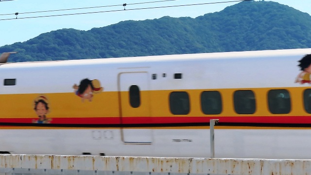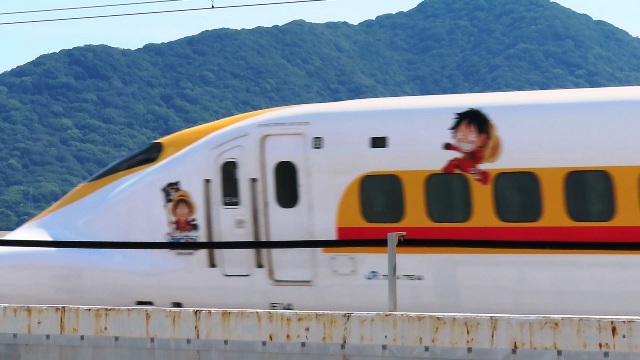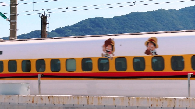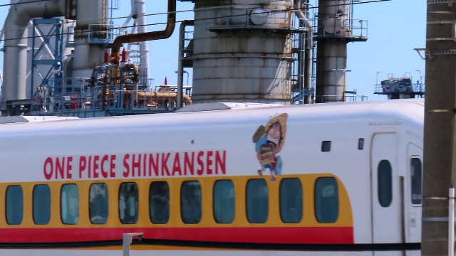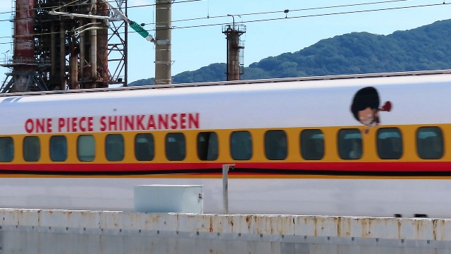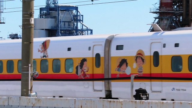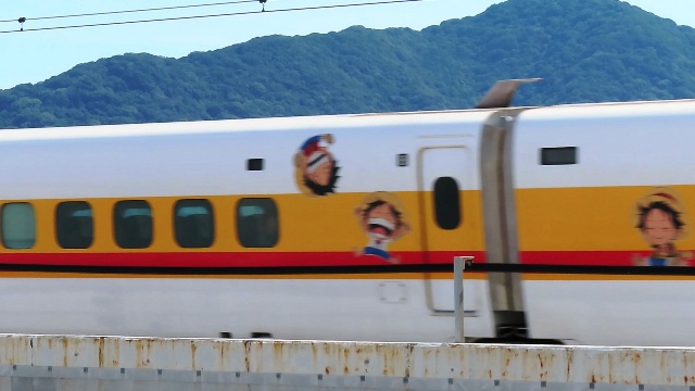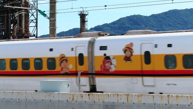 この新幹線は西日本エリア(新大阪〜博多)で運行しているワン ピース新幹線のモンキーDルフィ号です